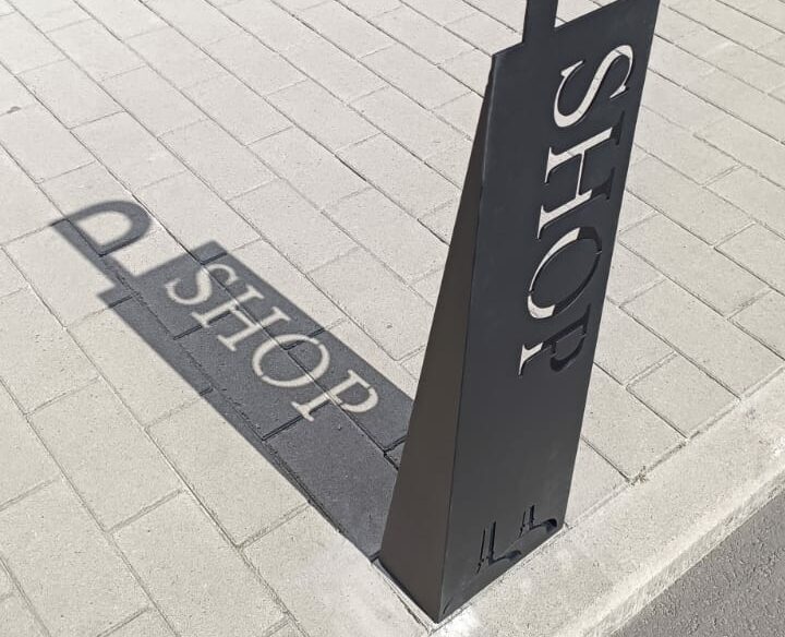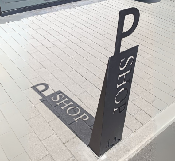 Création d’un totem de signalétique en acier découpé au laser, alliant esthétisme et fonctionnalité pour identifier élégamment les places de parking du shop.